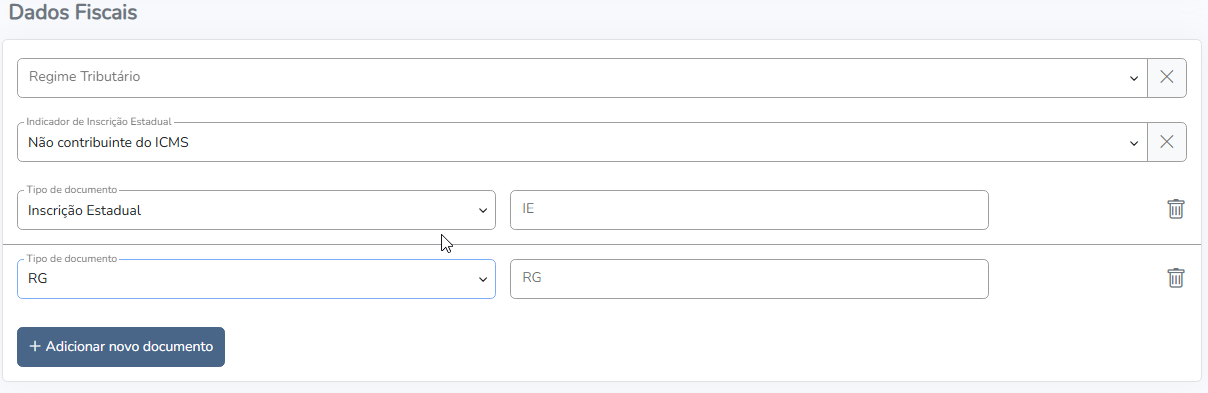 No caso de ter inscrição estadual, deve clicar em Adicionar um novo documento, definir como inscrição estadual e ao lado digitar a inscrição.