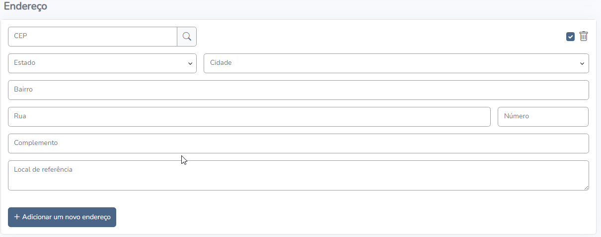 Para adicionar o endereço da pessoa deve clicar na opção Adicionar novo endereço no quadro de endereço, digitando o CEP o sistema buscará as informações do endereço automaticamente. Uma pessoa pode ter mais de um endereço cadastrado.