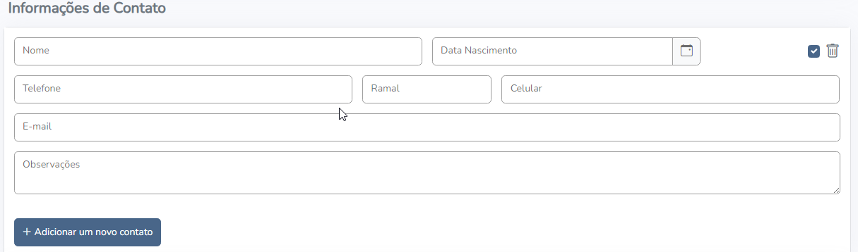 Pode ser adicionado ainda ao cadastro de pessoa informações de pessoas de contatos, para isto clicar em Adicionar novo contato, sistema aceita mais de um contato por pessoa.