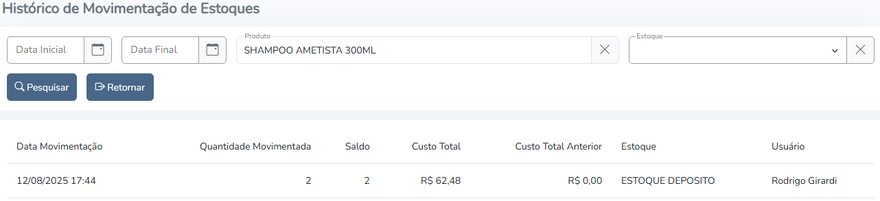 Poderá definir filtro de data que queira pesquisar as movimentações, selecionar um produto específico e o estoque da movimentação que deseja consultar. O sistema mostrará todo histórico de movimentação do produto de acordo com os filtros selecionados.