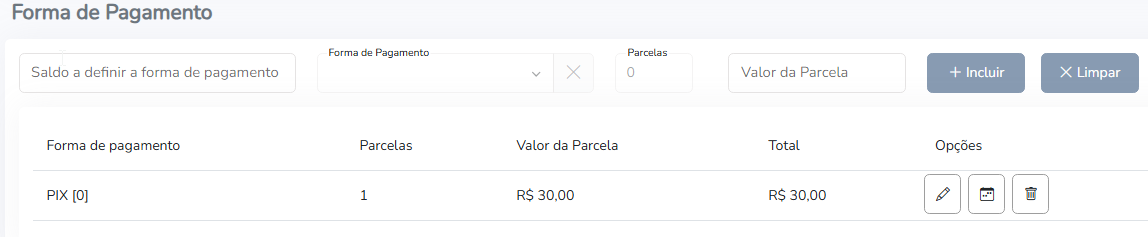 No quadro Forma de Pagamento deverá ser lançando o parcelamento da venda, selecionar a forma de pagamento, quantas parcelas foi negociado com o cliente, clicar em +Incluir.