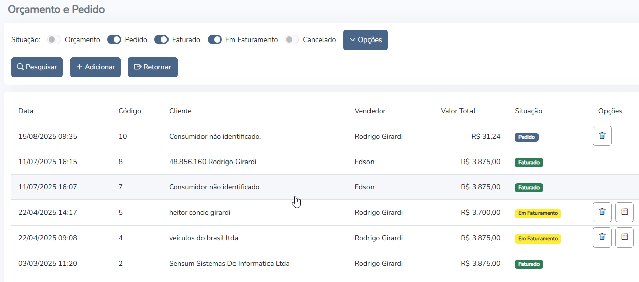Para abrir pedido em tela, clicar encima do pedido desejado, abrirá a tela de pedido.