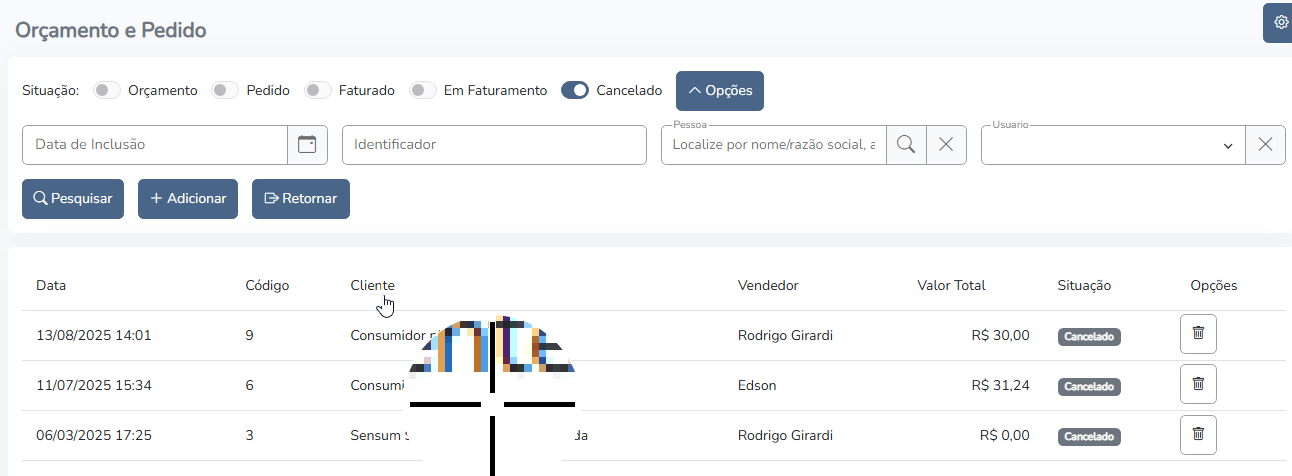Para consultar os pedidos cancelados no sistema, na tela de orçamento e pedido, deixar habilitado nos filtros de pesquisa apenas a opção Cancelado, clicar em Pesquisar.