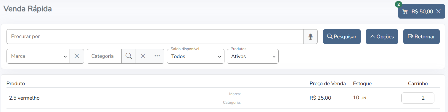 Além da pesquisa a tela proporciona a Venda Rápida dos produtos através do Carrinho de vendas, para alimentar o carrinho basta preencher a quantidade na coluna Carrinho na grade de pesquisa dos produtos. Ao preencher a coluna Carrinho o sistema exibirá o valor atual e a quantidade de itens no carrinho no campo
