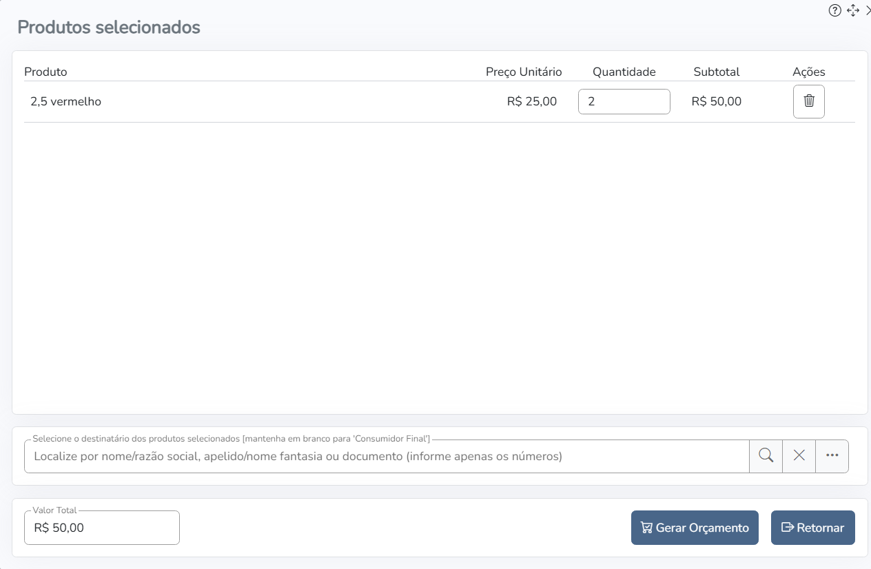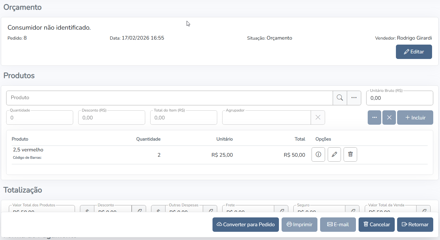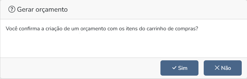 Após confirmar os dados do carrinho com o cliente, o que realmente irá querer comprar, o usuário poderá transformar o carrinho em um orçamento gravado no sistema.